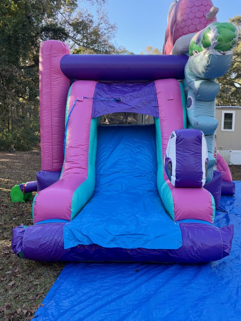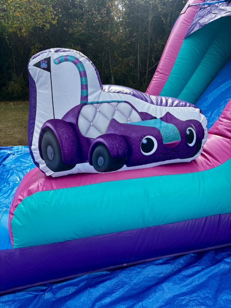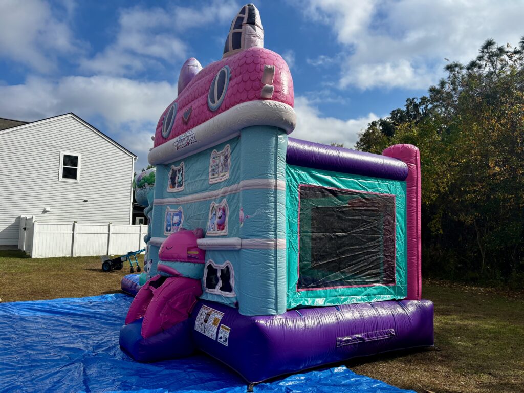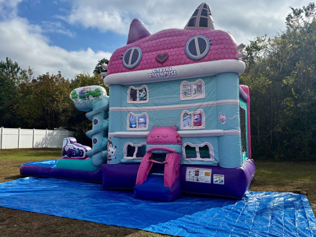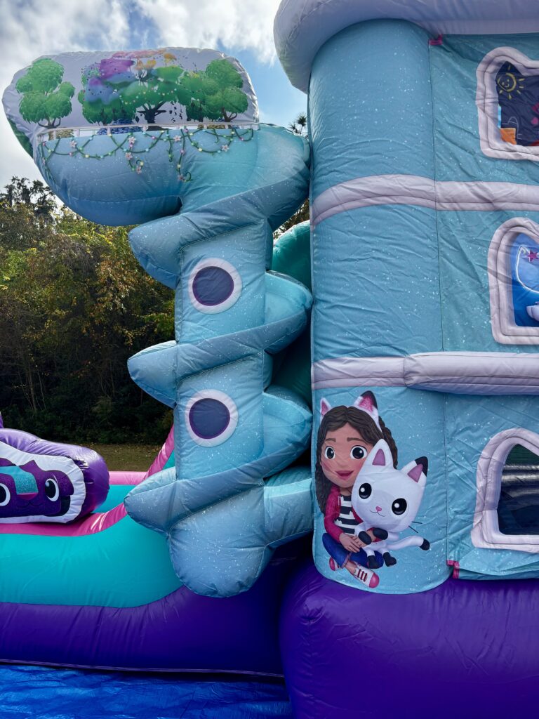 Dive into a world of fun with the Gabby’s Dollhouse Combo Water slide! This enchanting inflatable brings the magic of Gabby’s Dollhouse to life, offering a thrilling experience for kids as they slide and splash their way into Gabby’s World. Designed to look like Gabby’s Dollhouse. This unit features 3D inflatable popups and digital artwork of Gabby and her feline friends. The inflatable also includes a large bouncing area, built-in basketball hoop, climber and a slide that leads right into the refreshing pool splash area. The Gabby’s Dollhouse Combo Water slide turns any event into a magical adventure.